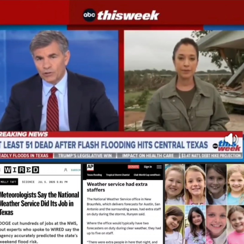 Just days after this horrific disaster, ABC News anchor George Stephanopoulos used his national platform — not to mourn, not to comfort, not to report the facts — but to launch a baseless political attack. On his Sunday morning program, with families still searching rivers and shelters for their missing children, Stephanopoulos falsely claimed that staffing shortfalls at the National Weather Service, allegedly caused by the Trump administration, contributed to the tragedy.