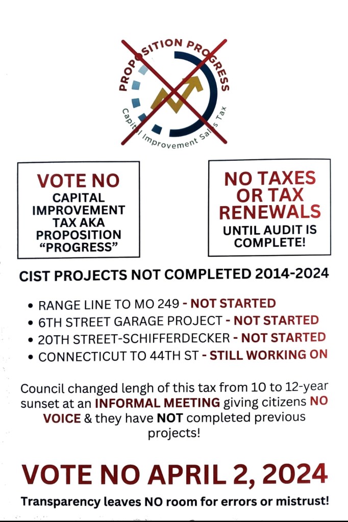 SPREAD THE WORD… VOTE NO ON the April 2nd CAPITAL IMPROVEMENT SALES TAX RENEWAL… aka “Proposition Progress”!