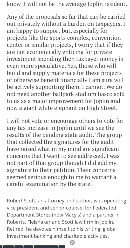 The Joplin Government leadership now wants more of our tax paying citizens and businesses hard-earned money, before ‘We the People’ even have a chance to get answers to the many fiscal concerns that the State Auditor is now examining, and ultimately presenting to our citizens.