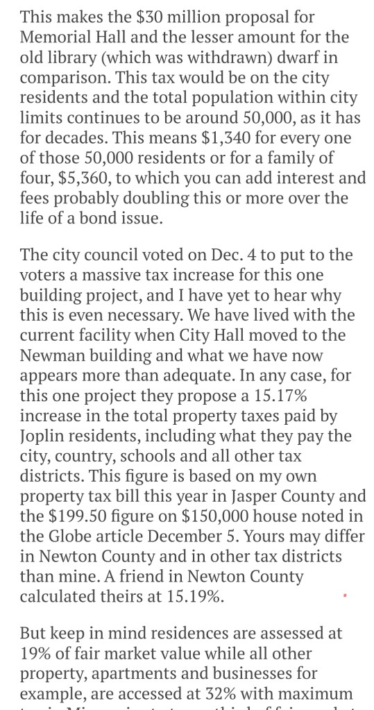 Considering the Joplin City Government’s budget is more than double the size of other cities throughout Missouri of similar size… even other cities like Bentonville, I find it incredibly concerning that they keep pushing for extensively bloated tax renewals that stretch for two years beyond a decade, which is an extremely long time before voters can demand or hold city officials accountable! Meanwhile, they are simultaneously pushing for massive property tax increases on citizens, just to pay for basic functions, when they should be in a financial situation to be calling for tax cuts to help citizens during this down economy!!!Regardless, Joplin Government says they don’t have enough tax dollars to pay our Police and Fire… or to maintain our parks and buildings like Memorial Hall or the Justice Center… or to even simply maintain our roads! However, in reality, none of their problems stem from our Joplin Government not getting enough tax dollars from citizens.. but are a result of their poor management of those dollars… BECAUSE THEY ARE NOT BEING EFFICIENT OR RESPONSIBLE WITH TAX DOLLARS… $181Million of your dollars!!Ultimately, the answer is for Joplin residents to force our city to be more responsible and efficient by VOTING NO on April 2nd to the Capital Improvement Sales Tax renewal! DEMAND THAT THEY STOP THE WASTE, OR WORSE… AND TELL THEM NO NEW OR RENEWED TAXES UNTIL AFTER THE CURRENT AUDIT by the Missouri State Auditor IS COMPLETE!